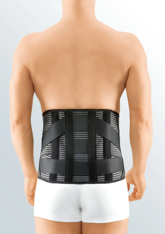 Rückenorthese zur Teilentlastung der Lendenwirbelsäule durch Entlordosierung, mit 3-Punkt-Gurtung, stufenlos verstellbaren Zuggurten, zwei Rückenhöhen und kraftsparenden Handschlaufen.